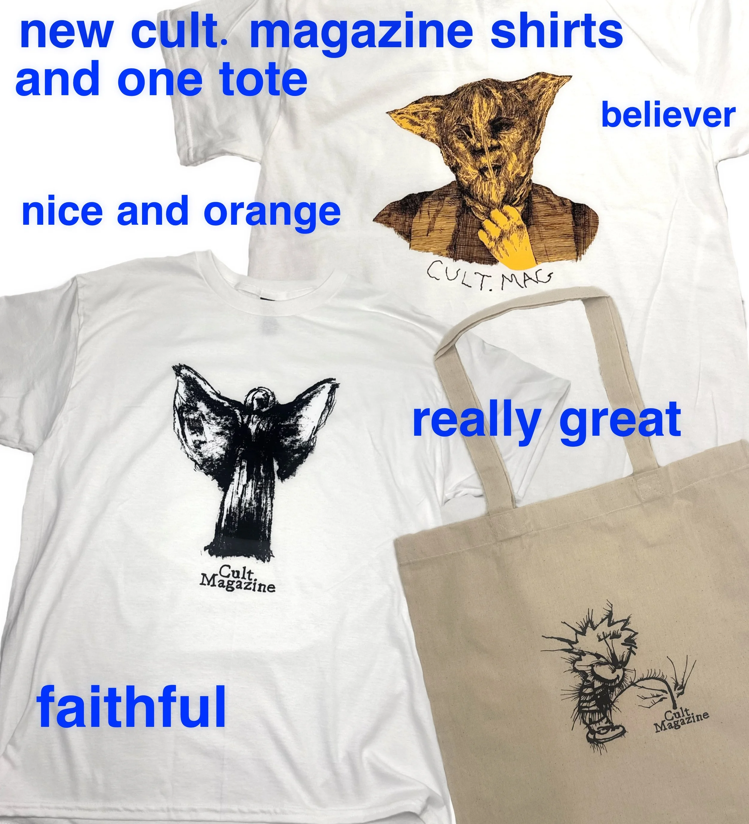 Yeeeeeaaaahhhhhh merch is back baby. Bag face shirt makes a triumphant return this time in a cool yellow. New Virgin Mary shirt for you little freakos out there. And we got a pee pee tote so you can show everyone how much you love us. We’re the best mag and we have the best merch. Put this one your body.